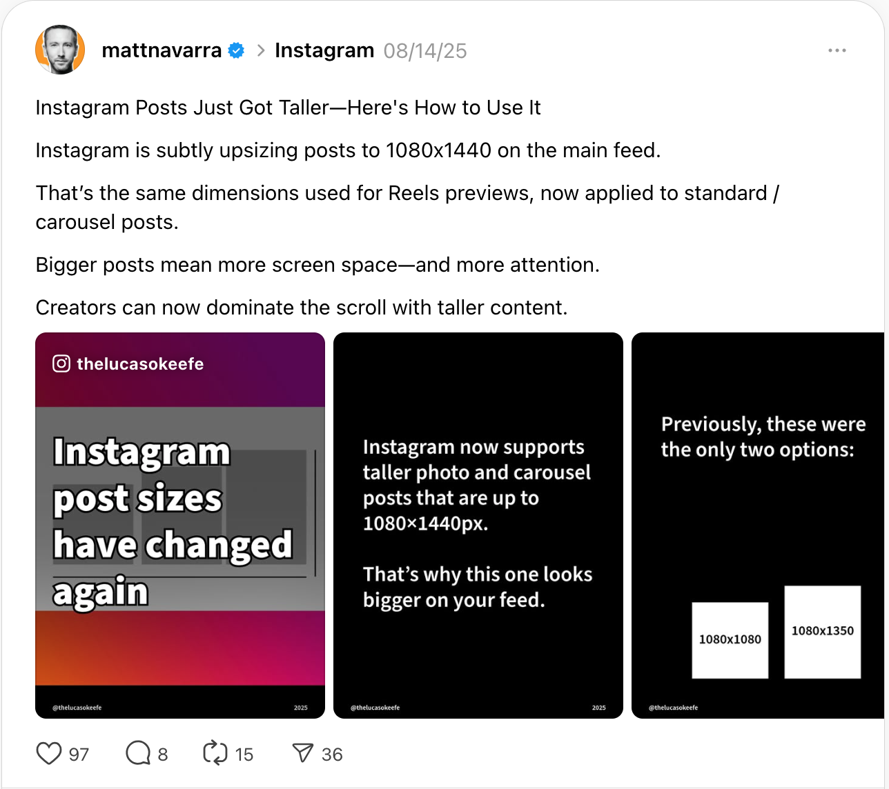Important to note that most scheduling apps still don’t allow for this format so you’ll need to keep creating for1080 x 1350 px if you aren’t posting manually.